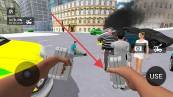 2、停车后,操控人物下车,拿医疗箱(点【USE】),靠近伤员,实施救助。