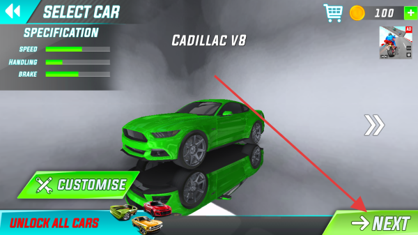 2、进入选车界面,选定绿色车辆后,点击右下角绿色【NEXT】按钮,进入特技赛道准备环节。