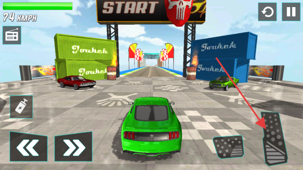 3、操控车辆时,利用右侧踏板控制加速,配合方向按键,驾驶绿色肌肉车冲向特技赛道,挑战高难度特技动作。