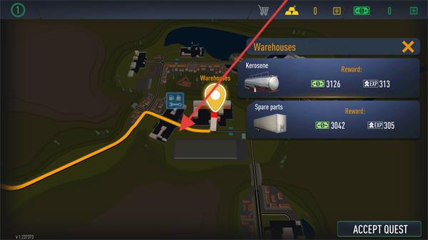 2、接“煤油任务”!地图点Warehouses,选Kerosene,奖励313,距离短,点ACCEPT QUEST,优先送。