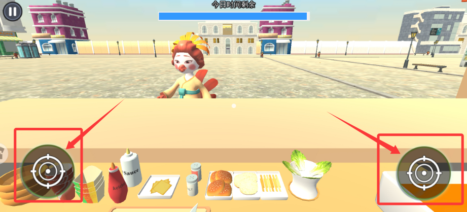 2、通过左右滑动屏幕控制移动方向,依据左右操作按钮,准备制作餐食。