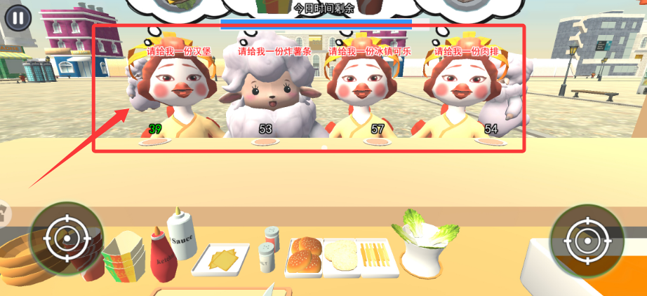 3、顾客出现后,查看其订单需求,利用桌上食材,通过操作按钮搭配、制作对应餐品。