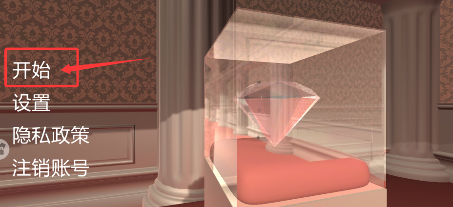 1、进入游戏界面,点击左侧“开始”选项,开启偷宝行动挑战。
