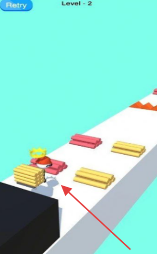 1、操控卡通角色背着基础阶梯在平原赛道奔跑,首次用阶梯跨越小沟壑熟悉跑酷操作。