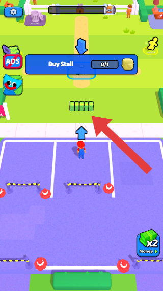 1、呈现的是购买摊位相关界面,上方有购买摊位的进度显示,还有双倍金币等功能按钮,属于模拟经营类的放置场景,玩家可通过经营摊位等积累财富、拓展业务。