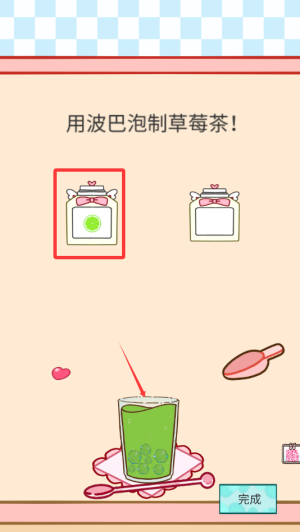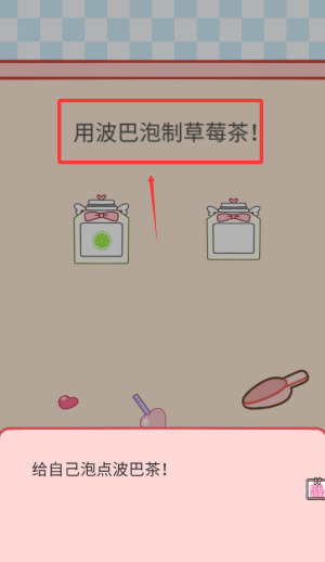 1、点击左边带绿点的罐子,开始制作草莓波巴茶。