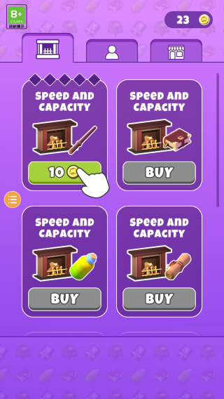3、呈现“SpeedandCapacity”(速度与容量)相关的升级选项,玩家可花费金币(如10金币)购买道具提升博物馆经营属性,属于强化设施、优化经营的环节。