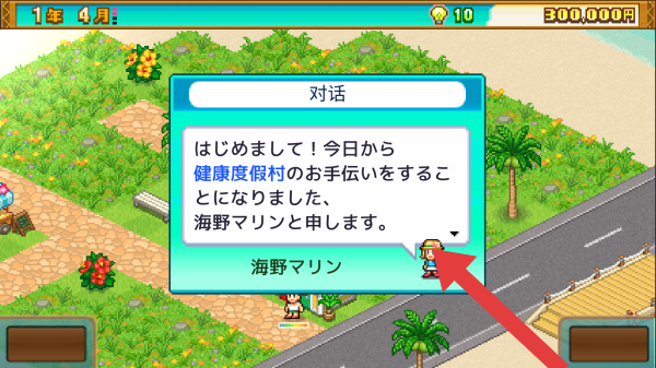 2、呈现的是角色海野玛丽琳对话场景,其提到“初次见面!我是从今天开始帮忙健康度假村事务的海野玛丽琳”,属于模拟经营度假岛过程中的角色互动环节。