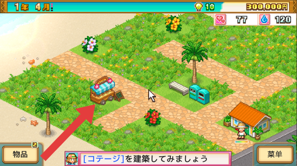 3、呈现的是度假岛经营场景,有“1年4月”“300000P”等时间与资金显示,还有可建造的“售货亭”提示,属于模拟经营度假岛,进行设施建设、场景规划的玩法环节。