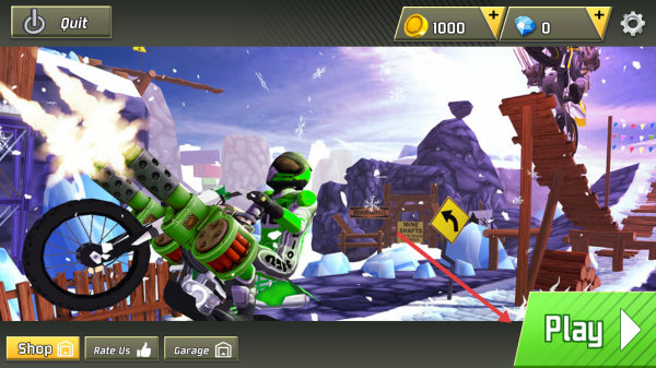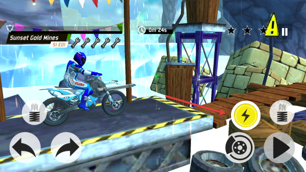 2、用虚拟按键控摩托,遇坡道(木架)加速腾空,按地形(冰雪、岩石)调车速、平衡。