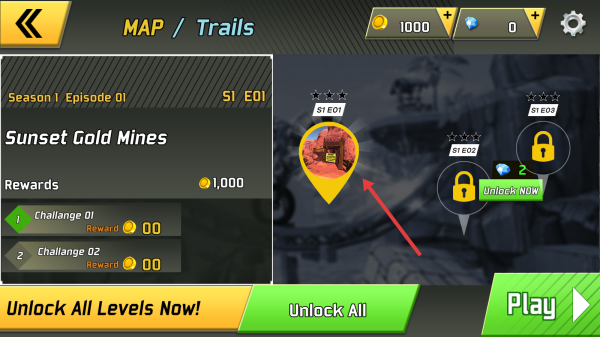 3、完成“Challenge01/02”获金币,去“Garage”改装摩托(武器、性能),解锁新关卡(S1E02)。