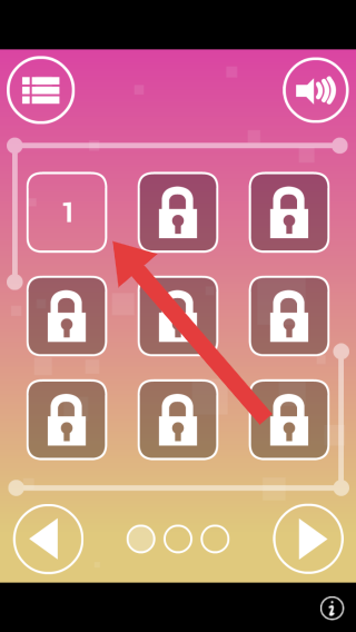 2、实体信息有“1(代表可玩关卡)”、多个带锁图标,还有菜单(左上角列表图标)、音量(右上角喇叭图标)、切换关卡(左右箭头)等交互元素。