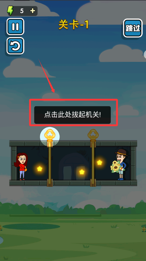 2、根据操作点击此处拨起机关,就能过障碍物。