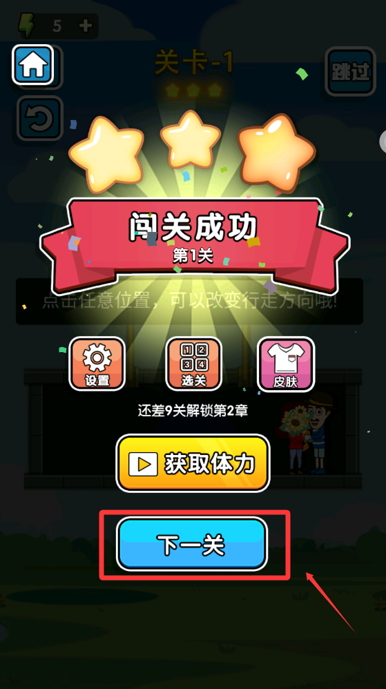 3、通关后点击下一关按钮继续挑战新的关卡。