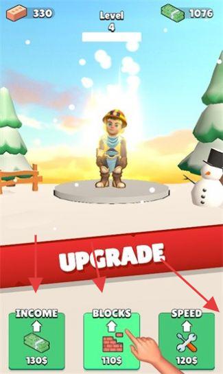 2、花费金钱升级“INCOME(收益)”“BLOCKS(砖块)”“SPEED(速度)”,提升建塔效率与收益。