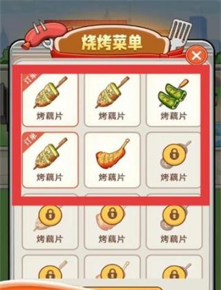 2、接单制作:查看“烧烤菜单”,依据订单需求,烤制对应菜品(如烤藕片)。