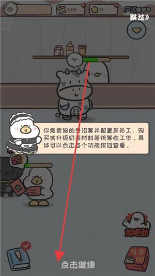 2、按提示,点击功能按钮,进行员工招募、配置,采购或升级奶茶材料,完成筹备工作,保障店铺运转。