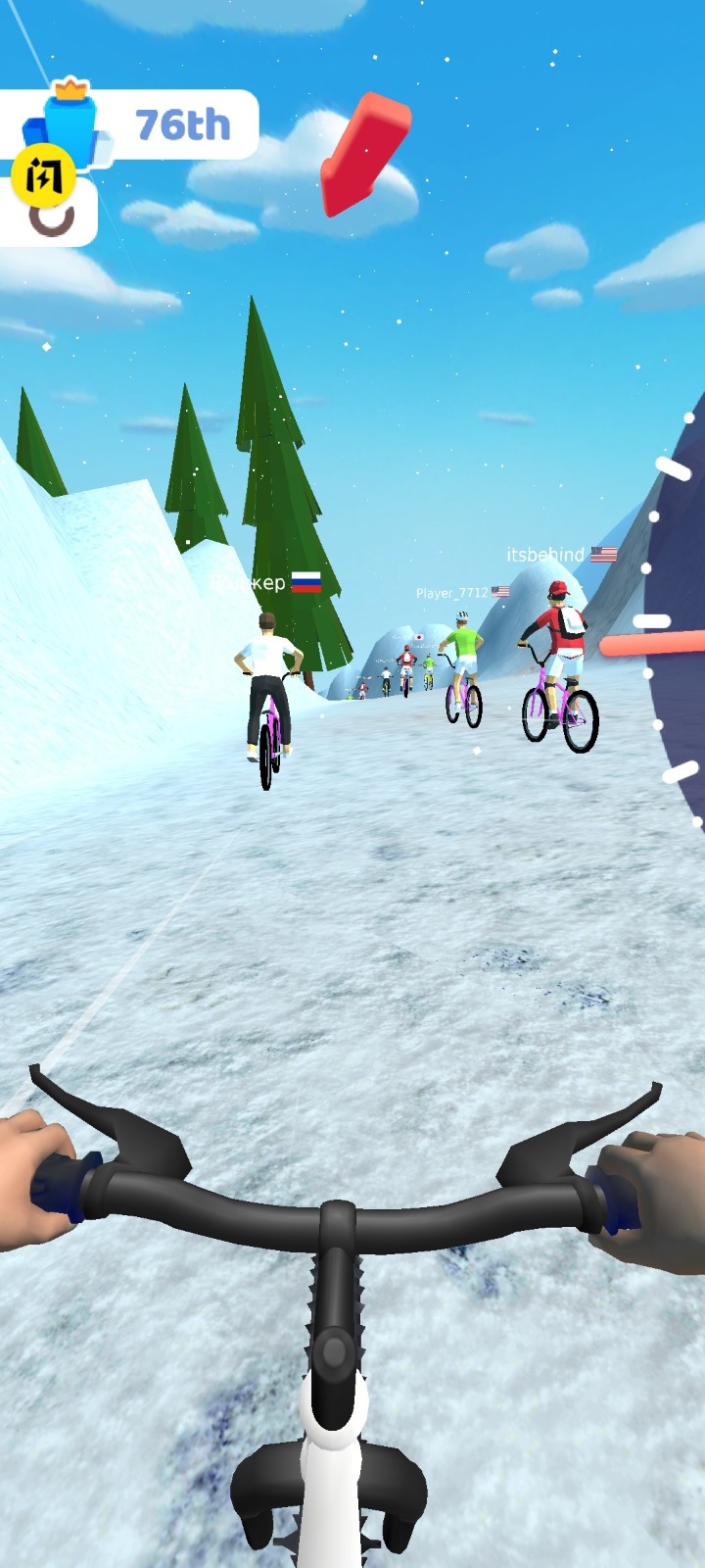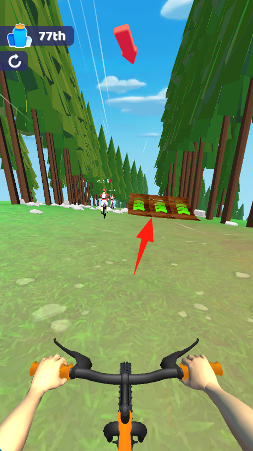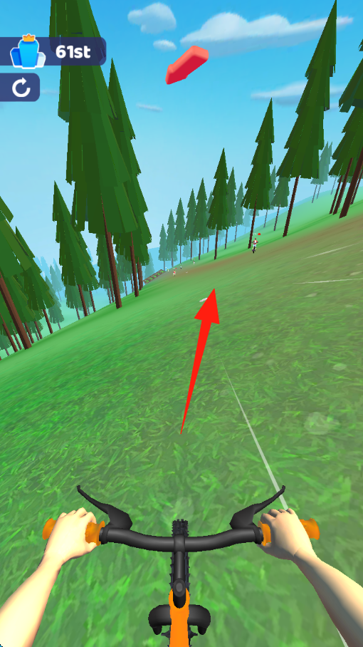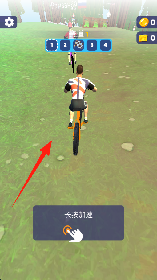 1、开局阶段,长按【箭头】下方“长按加速”按钮,提升自行车速度,追赶前方选手。