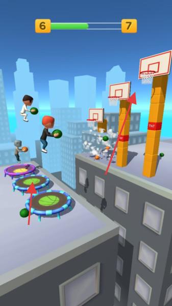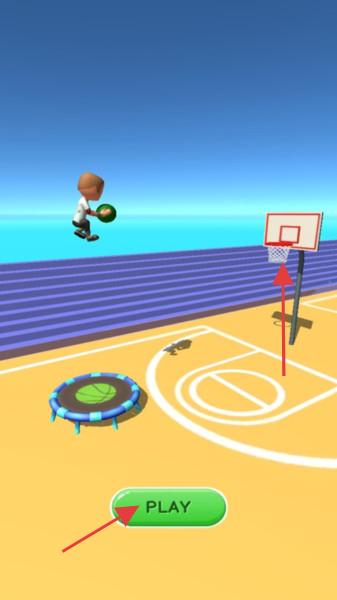 1、接触基础蹦床操作与投篮技巧,学习如何利用蹦床弹跳力调整投篮姿势与力度,在简单训练关卡熟悉游戏机制。