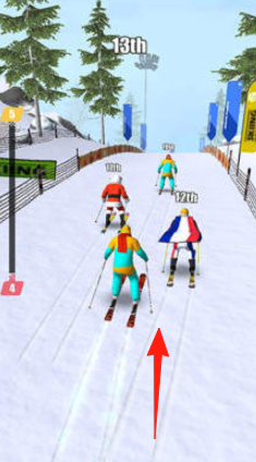 1、滑雪赛道上,操控角色,沿【箭头】方向,加速滑行,超越前方选手。