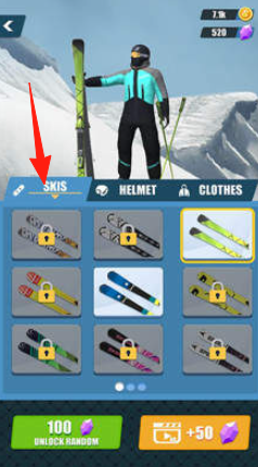 2、装备选择界面,点击【箭头】指向的“SKIS”,用货币解锁或升级滑雪板。