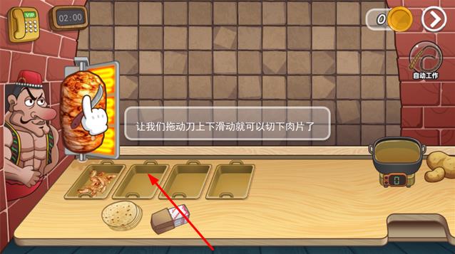 2、拖动刀上下滑,切肉片,搭配饼与配料,制作沙威玛,满足顾客。