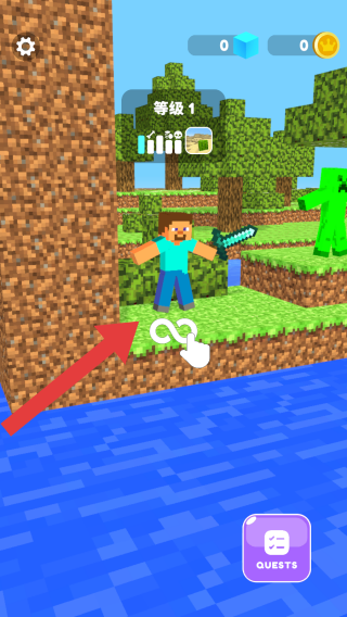 1、画面中有一名穿着蓝色上衣和蓝色裤子的角色,手持一把剑,等级显示为1,右上角显示方块和金币数量,右下角有“QUESTS”(任务)按钮。