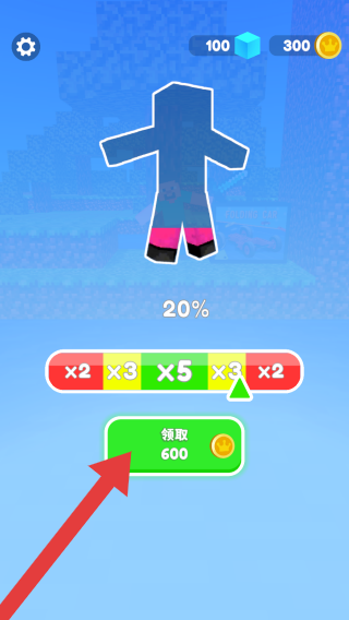 2、画面显示一个角色轮廓,进度为20%,下方有倍率选项,绿色按钮上文字“领取600”,左上角是设置图标,右上角显示方块数量100、金币数量300。