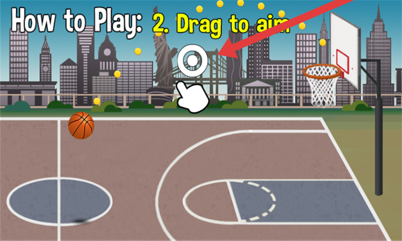 2、跟随教程提示【How to Play2Drag to aim】,拖动瞄准图标(白色圆圈),调整投篮角度与力度。