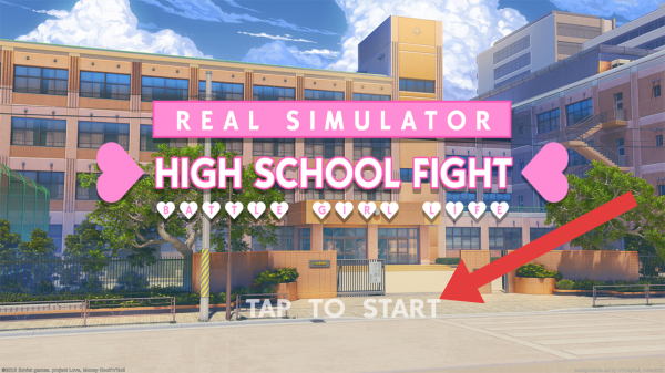 1、画面有“REALSIMULATORHIGHSCHOOLFIGHT”标题,点击【TAPTOSTART】(点击开始)提示,背景是校园场景。