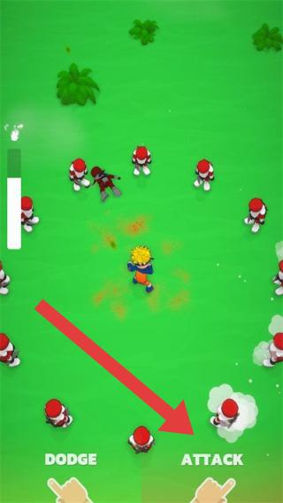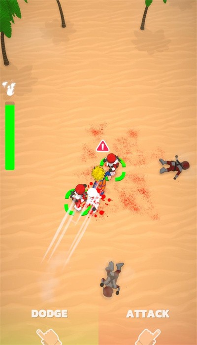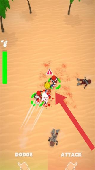 2、游戏场景为沙漠地带,有棕榈树,画面中角色正在战斗,屏幕下方有“DODGE”(躲避)和“ATTACK”(攻击)按钮进行攻击。