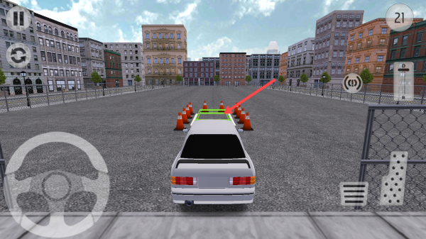 2、在停车场场景,操控车辆,用虚拟方向盘、按键,沿路线行驶,避开橙色路锥,瞄准绿色框位。