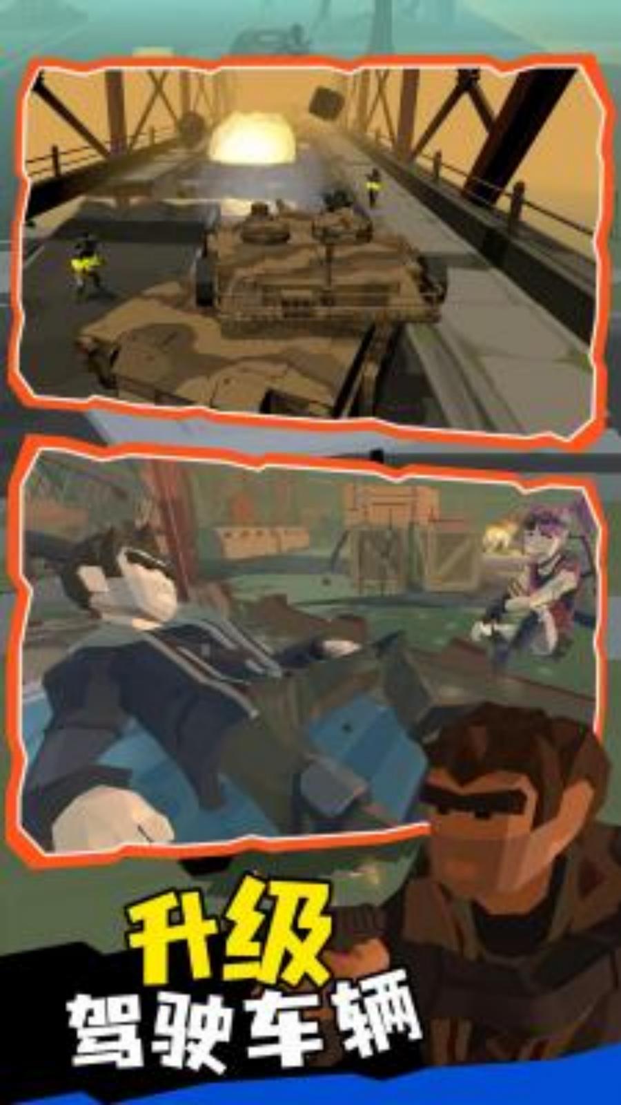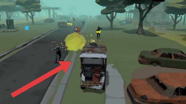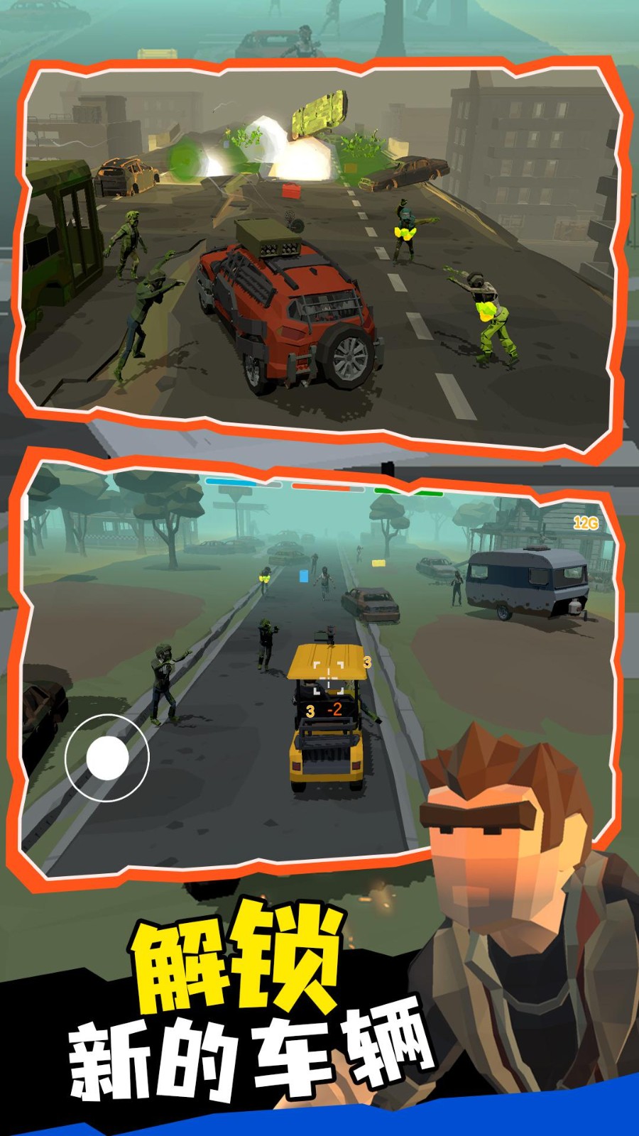 1、呈现低多边形风格,画面中有一辆带有喷射装置的车辆,周围有僵尸的角色,是末日生存或射击类。
