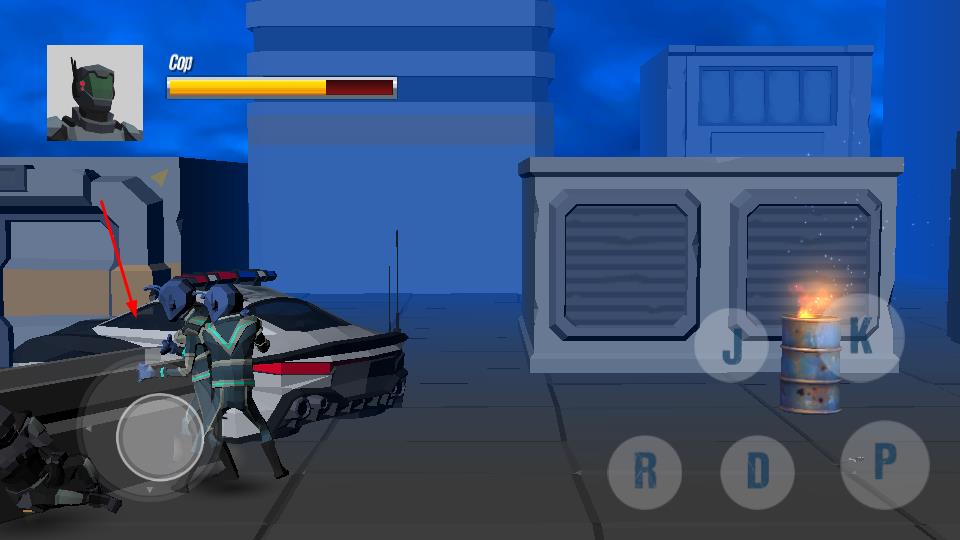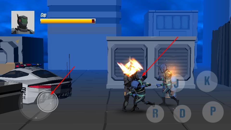 3、关注左上角“Cop”血量条,灵活走位、连招打击敌人,在城市环境(建筑、警车场景)中推进战斗进程。