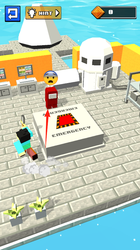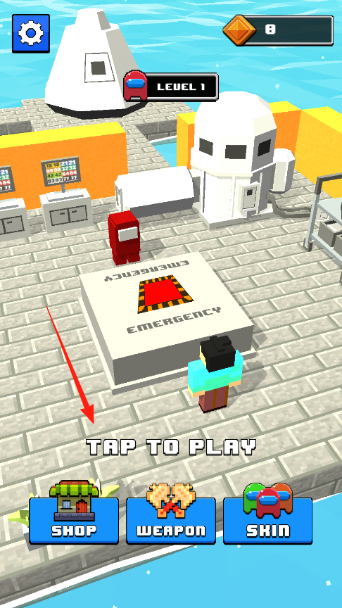 1、在初始场景,点击“TAPTOPLAY”文字区域(箭头指向),正式开启游戏,进入包含建筑、敌人的战斗地图,此时钻石数量为8。
