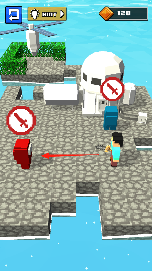 2、操控角色(穿蓝绿衣服),靠近红色敌人(箭头指向),自动或点击攻击,击败敌人获取钻石(从8到128)。