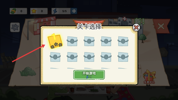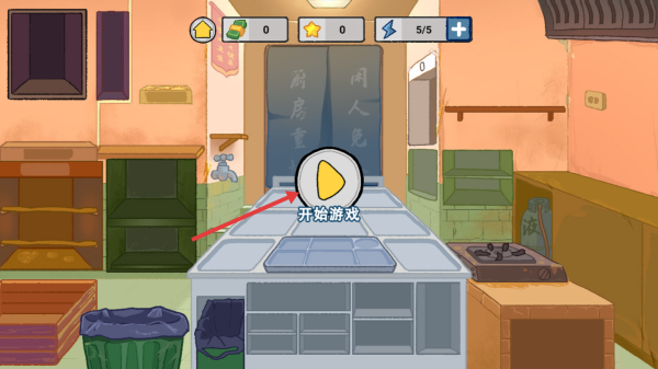 1、在关卡选择界面,选第1关带3星标识,点击开始游戏,进入厨房场景。