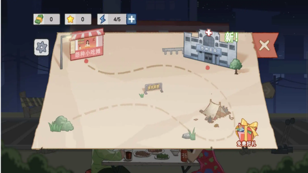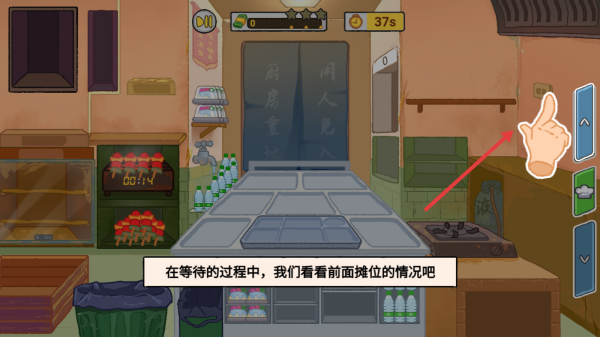 3、等待中按指引点击右侧按钮,查看摊位情况,完成流程,积累资源解锁后续关卡。