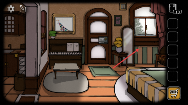 2、在房间场景中,按箭头提示探索钢琴等区域,留意可交互点,寻找解谜道具。