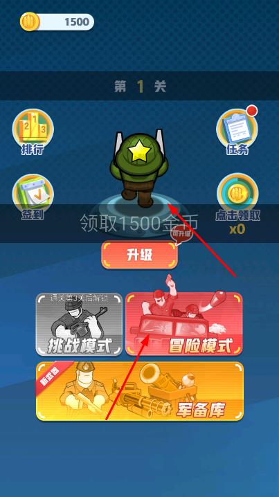 1、进入界面,领取金币以及升级角色等操作,完成准备后,选择冒险模式开启游戏关卡。