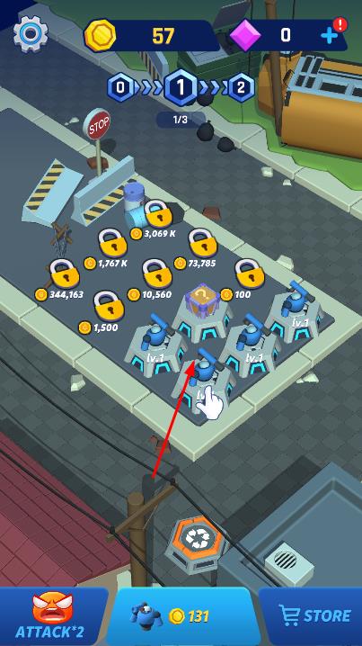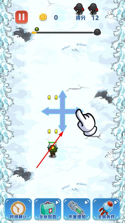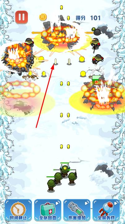 2、通过滑动屏幕操控大兵角色移动,躲避敌人发射的弹药,同时大兵会自动攻击敌人,消灭敌人后可收集掉落的金币。