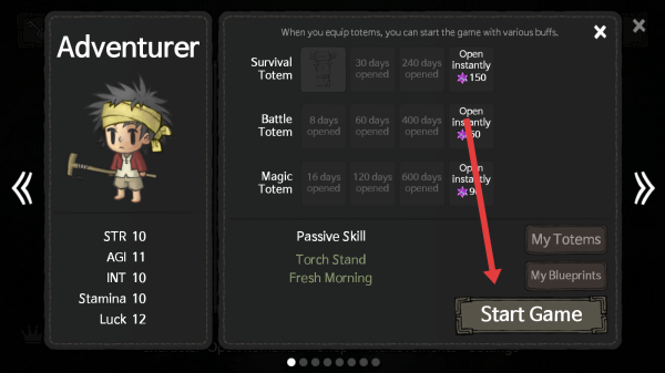 3、角色界面选定Adventurer,点击Start-Game按钮,凭借图腾增益与被动技能,正式踏入荒野,开启生存试炼。