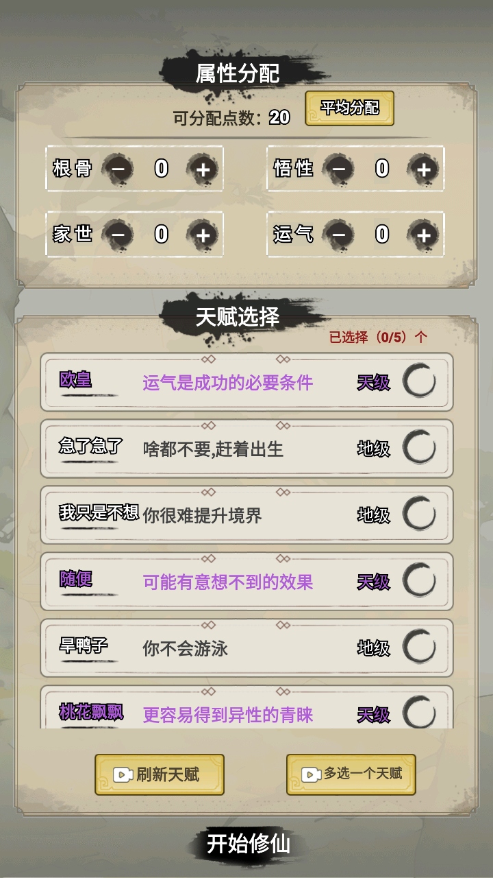 1、进入游戏后,玩家需要将属性按照自己的想法分配好,还有选择天赋