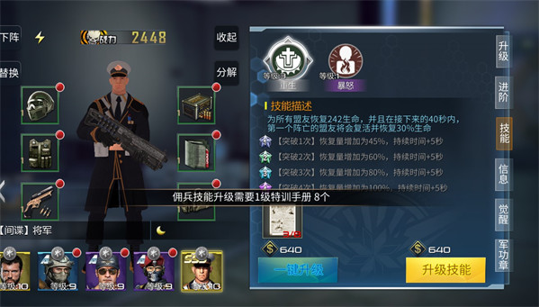 佣兵拥有不同的等级:SSS、SS、S、A、B级,SSS级自然是最强佣兵。佣兵界面右侧是基础属性,佣兵可提升自身升级、技能等级。低品质佣兵还可以进阶提升战斗力。