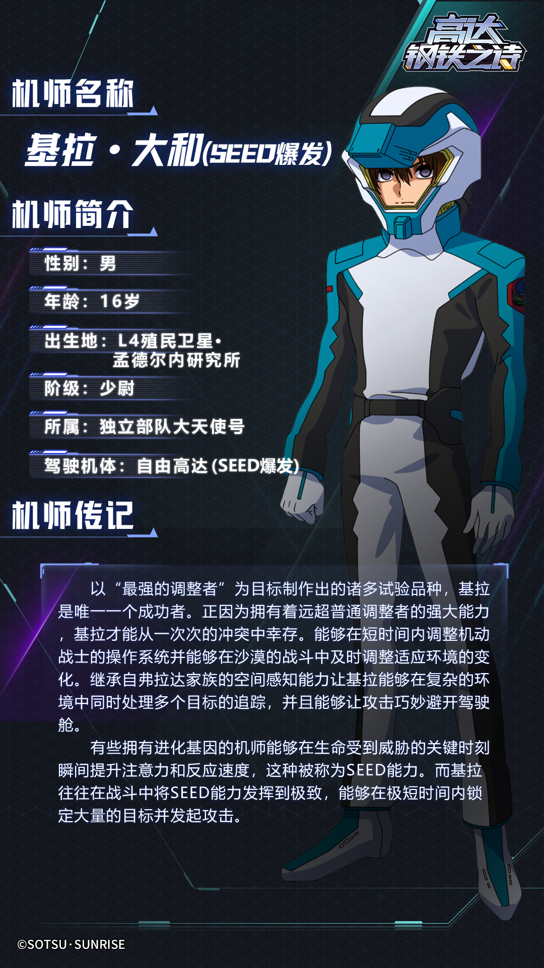 技能效果:基拉会优先攻击敌方最具威胁的机体,攻击敌人中攻击最高者,并有50%概率降低其15能量。友方机体使用必杀技时,有15%概率对随机1名敌人附加3秒[眩晕]。