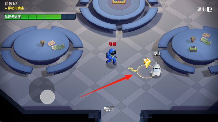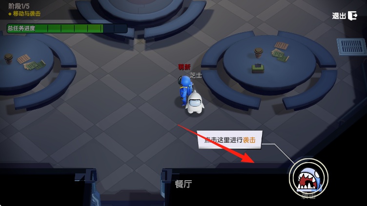 1、内鬼视角,阶段1/5移动与袭击,在餐厅,操控萌新靠近芝士,红箭头指引,准备袭击,注意总任务进度避开船员。