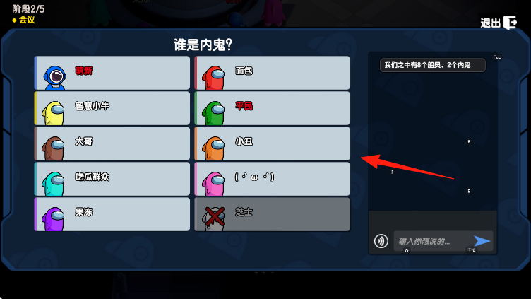 3、阶段2/5会议,芝士被淘汰,进入投票,红箭头指存活船员8船员、2内鬼,内鬼萌新需伪装,诬陷他人,引导投票,保护队友。