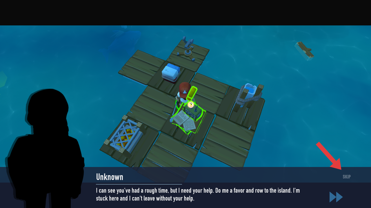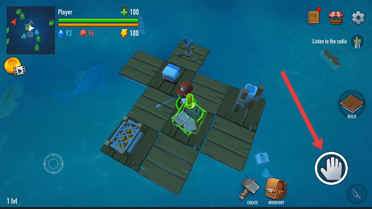 1、开局进入游戏,需要点击屏幕右侧手型的按钮,与木筏上的装置进行互动,触发剧情任务。