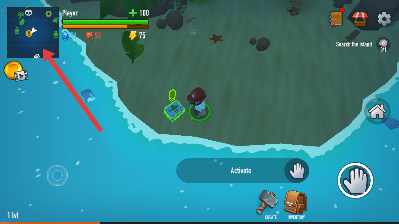 3、关注左上角地图的区域,跟随黄色感叹号标记,前往岛屿完成Search the island探索任务。