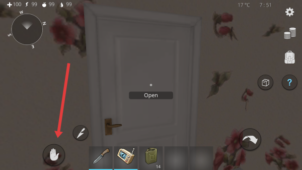 2、靠近房间门时,点击底部手部图标,触发Open交互,打开房门,离开当前区域,前往新场景继续探索。